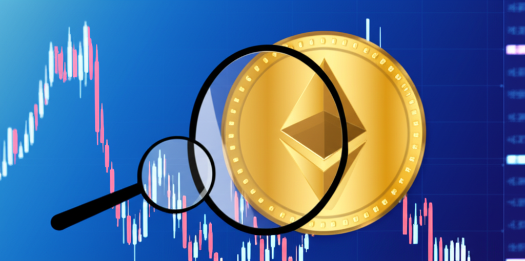 以太坊投資分析插圖,顯示市場圖表與放大鏡,象徵投資分析與市場指引